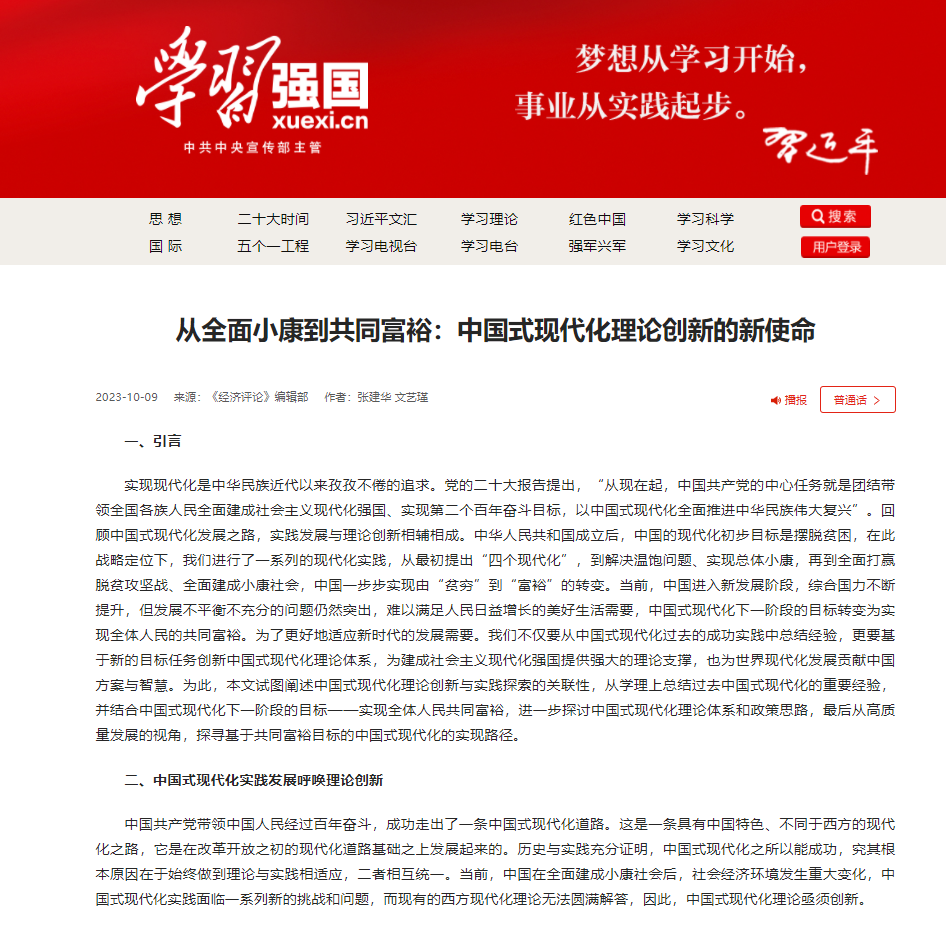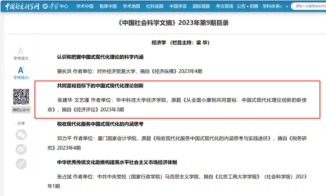 本网讯(通讯员:张鹃)永利3044noc张建华教授与博士生文艺瑾完成的中国式现代化研究最新成果《从全面小康到共同富裕:中国式现代化理论创新的新使命》发表在《经济评论》2023年241卷第3期,为当期封面文章。近日,该论文被《中国社会科学文摘》2023年第9期摘录,并且被中宣部“学习强国”平台全文转载。