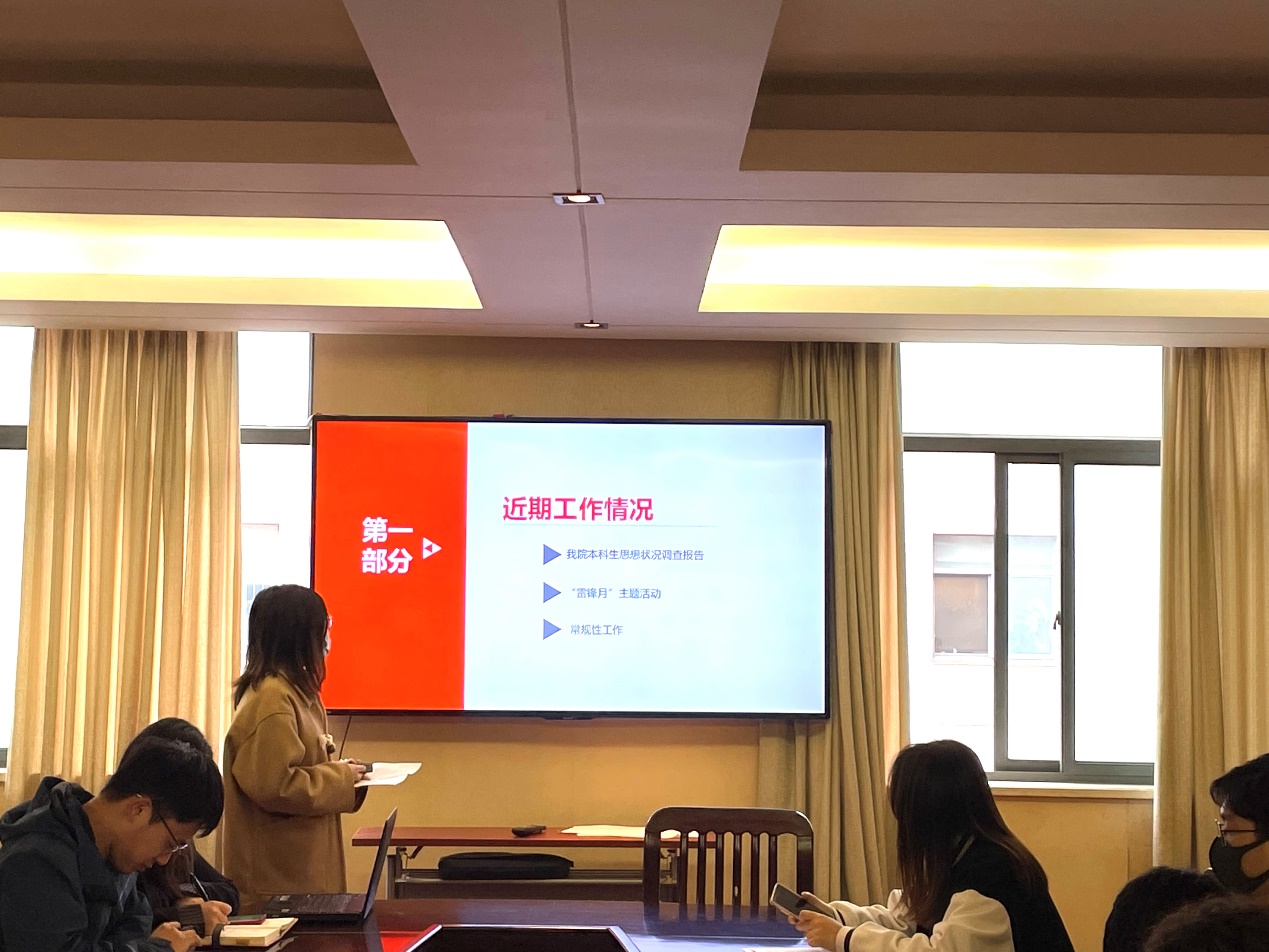 微党课讲授结束后,院员工党建主席团成员覃丽芸同学从本科生思想调查报告、雷锋月主题活动、常规性工作为切入点,对近期党建工作进行总结,指出工作中的不足和思考,并汇报了员工党建小组的未来工作计划。会议最后,袁悦老师指出部分入党志愿书时效性差、准确性低等问题,强调支部书记应站好最后一班岗,确保完整地完成工作。