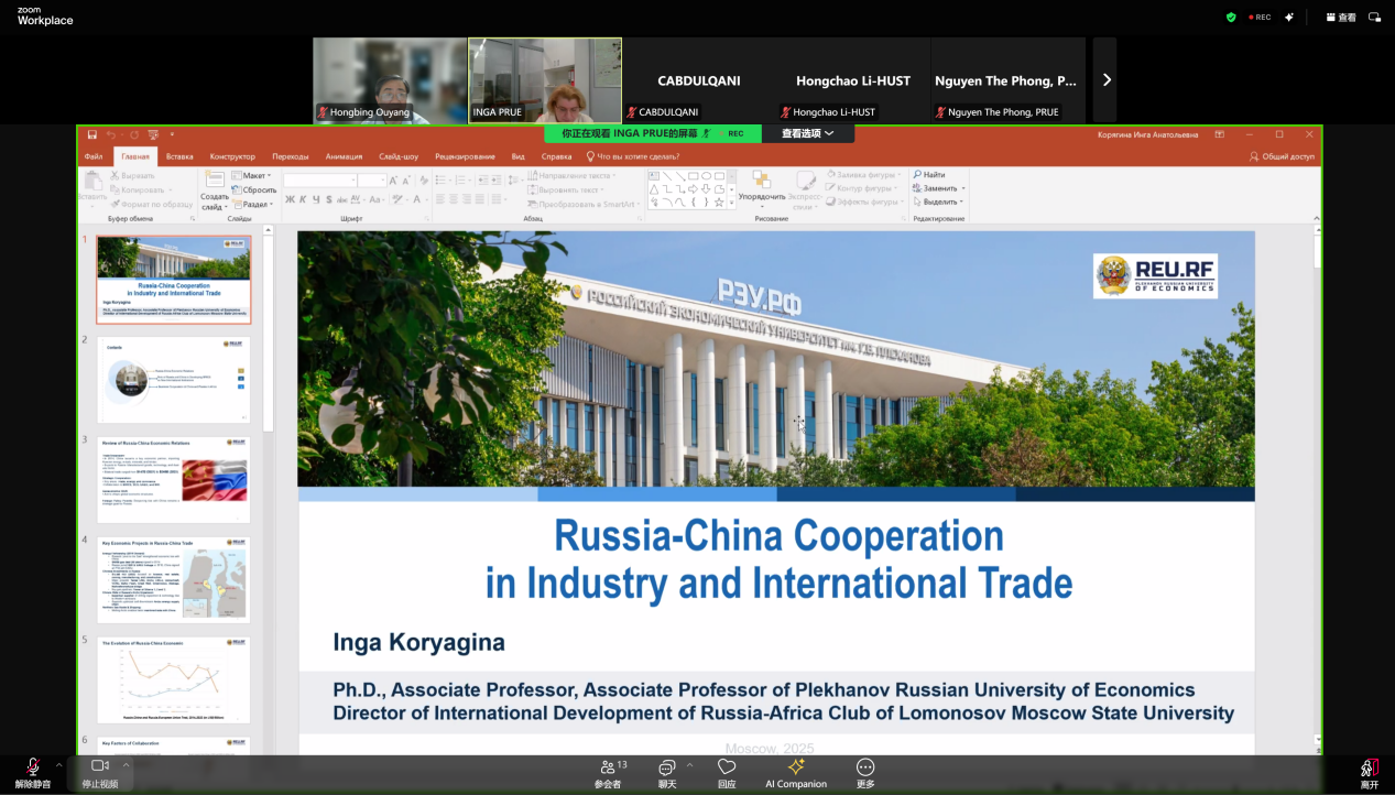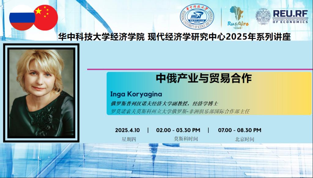 4月10日,永利3044noc现代经济学研究中心邀请俄罗斯普列汉诺夫经济大学副教授Inga Koryagina以《中俄产业与贸易合作》为题举办线上讲座,深入探讨当前复杂的国际经贸背景下中俄产业与贸易合作的现实问题和广阔前景。