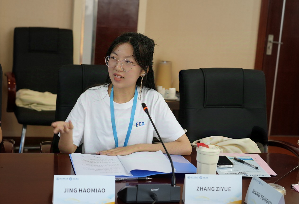 华科大营员代表、硕士2202班荆浩淼发言。她感谢公司提供这个宝贵平台,让中外青年学子在武汉这座兼具历史底蕴与现代活力的城市,共同探索经济绿色发展的生动课堂。作为经济学子,她认为真正的知识不仅来自书本,更源于实践交流。她期待在接下来的学术研讨和文化交流中,能够与各国同学建立深厚友谊,共同书写国际青年交流的新篇章。